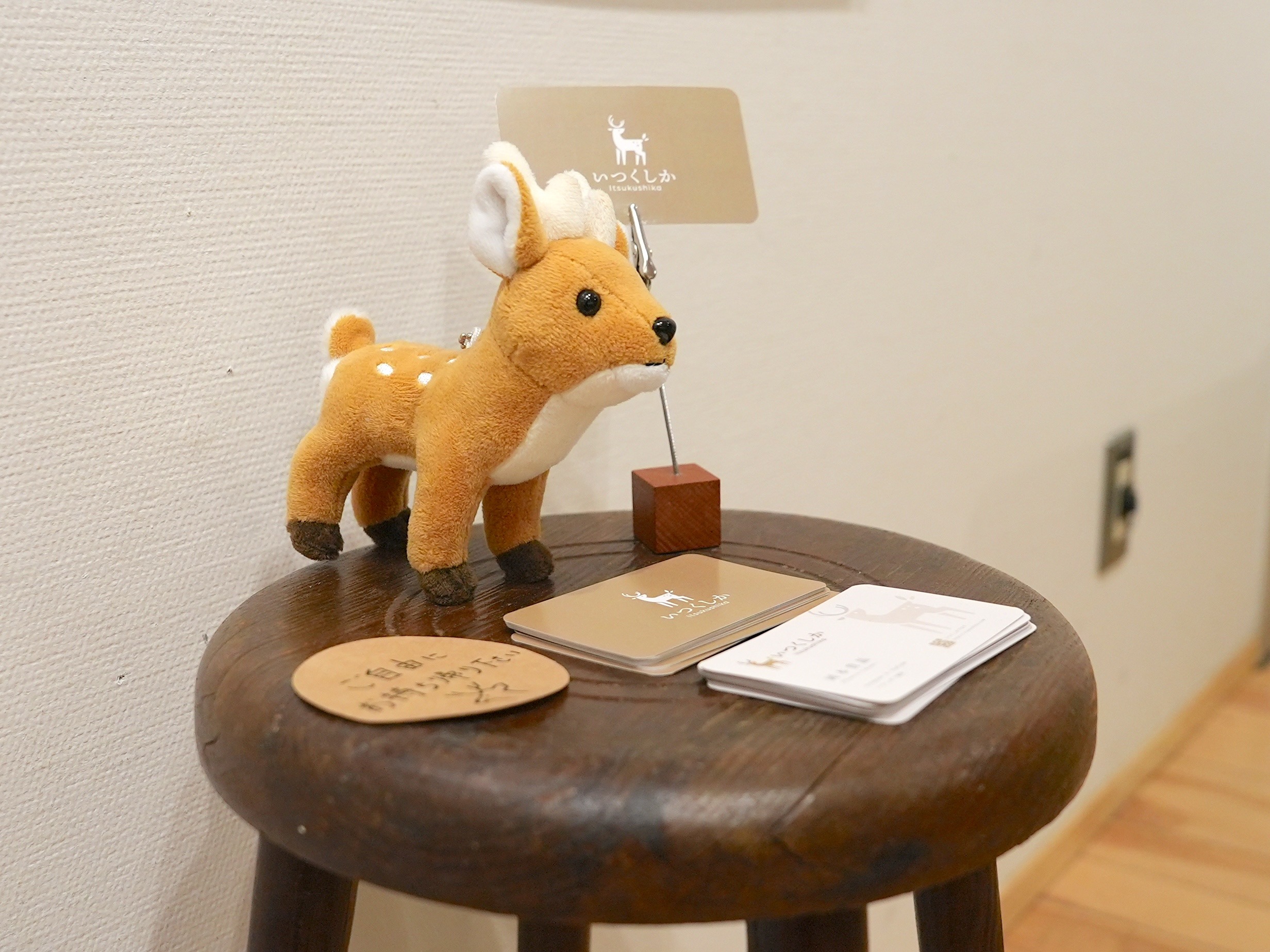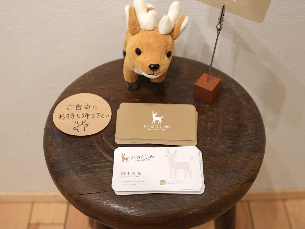 椅子の上に名刺だけだと少し寂しい感じがしましたので、鹿さんのぬいぐるみと「ご自由にお持ち帰りください」のポップを添えました。